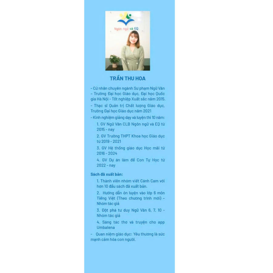 Là Thạc sĩ Quản trị Chất lượng Giáo dục với hơn 10 năm kinh nghiệm dạy các cấp học và ôn luyện thi 9 lên 10, thi tốt nghiệp THPT. Cô Trần Thu Hoa nhận thấy kĩ năng đọc hiểu văn bản của các bạn còn gặp nhiều khó khăn. Đặc biệt khi đối mặt với các câu hỏi đọc hiểu đòi hỏi tư duy cao, nhiều bạn còn lúng túng và thường bị mất điểm. Vì vậy cô đã viết nên cuốn sách “Chinh phục các dạng đề đọc hiểu” với nội dung theo định hướng “Chương trình Giáo dục phổ thông 2018” giúp học sinh phát triển năng lực đọc hiểu một cách hệ thống và hiệu quả.